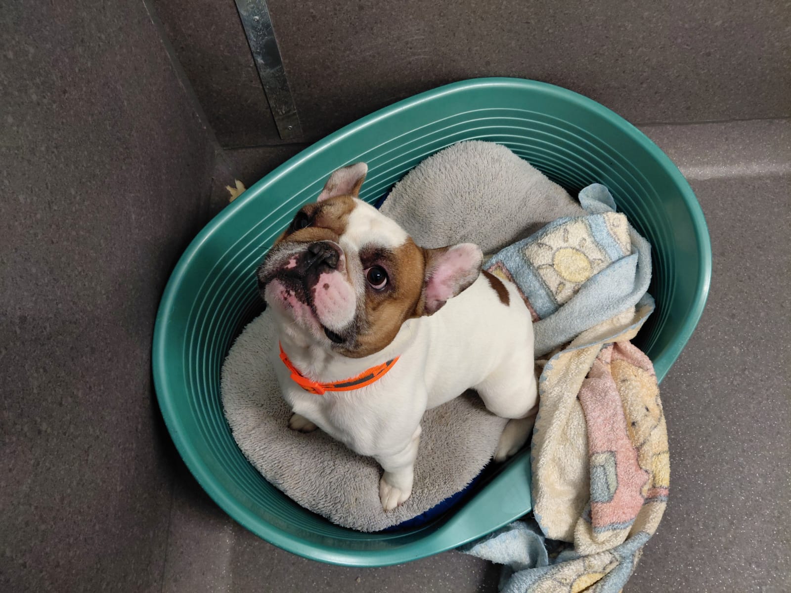 Französische Bulldogge Zeus kam, gemeinsam mit Kumpel Rambo, durch eine behördliche Abnahme in unsere Obhut.
